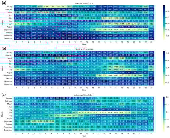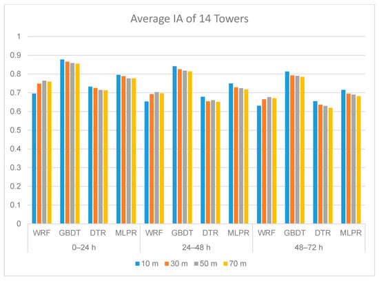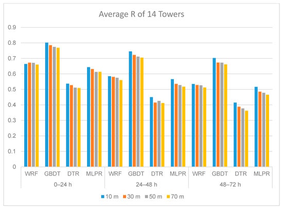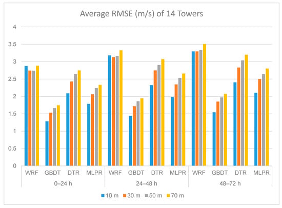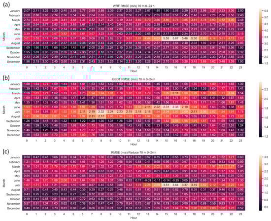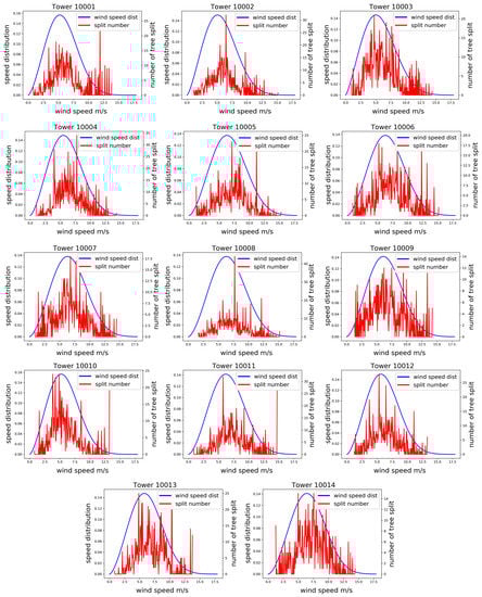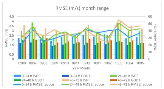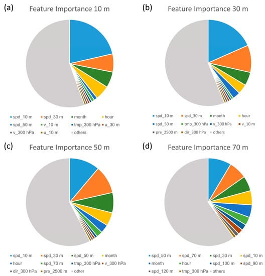 In each month, we chose the data in date 3, 7, 11, 15, 19, 23, and 27 as test data and data in other date as train data. Table 6 shows the train and test data split in one month. For each wind tower, we trained the GBDT model on the WRF output observation speed at different forecast times (0–24 h, 24–48 h, and 48–72 h) and different heights (10, 30, 50, and 70 m).