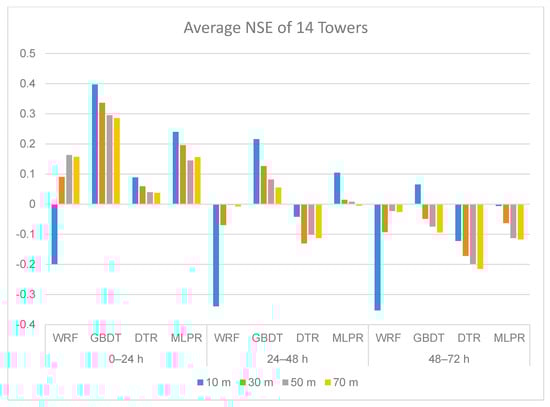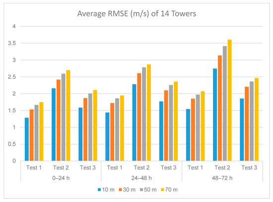 The ETA values of the near-surface layers were 1.0000, 0.9960, 0.9920, 0.9900, 0.9851… The average altitudes of near-surface layers in model domain were 16.07, 48.22, 72.36, 101.16, and 134.84 m. It can be seen that there are models layer near 50 m and 70 m. The height of the wind tower data is 10, 30, 50, and 70 m. For the data of 10 m, we use the output result of the wind speed of 10 m in WRF model. For data at other heights, we use linear interpolation in the vertical direction for interpolation. Despite the nonlinear characteristics of the wind in the boundary layer atmosphere, due to the existence of model layers at the heights of 50 m and 70 m, the nonlinear changes in the boundary layer have no significant effect on the results of 50 m and 70 m.