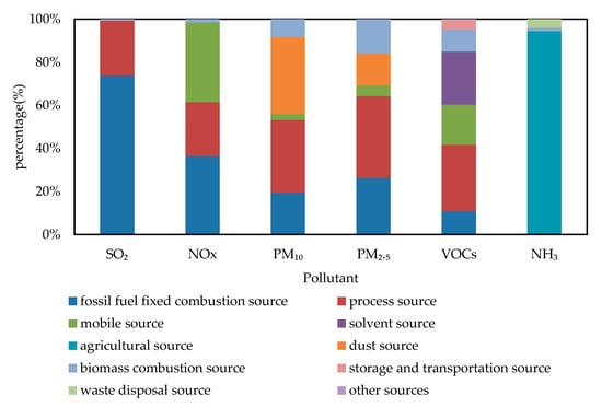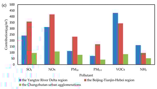 Figure 2 shows the emission contributions of 10 source categories in the CZT urban agglomeration. Stationary fuel combustion source and process source are the main sources of SO2, contributing 73.75% and 25.61%, respectively, to the total emissions. The largest contribution of NOX emissions is from the mobile source (39.45%) and stationary fuel combustion source (34.91%). It is worth mentioning that the car is the main source of nitrogen oxides and particulate matter on the road. Among them, the truck discharge contribution rate is twice that of the passenger car. Therefore, reducing the number of cars effectively plays a significant role in controlling NOX emission. In addition, thermoelectric production also contributes to the formation of NOX. The process source is the primary source of PM10 and PM2.5, contributing 35.12% to the emission, followed by the dust source (about 26.63%). When it comes to the industrial sectors, the emissions from building materials production and ferrous metal smelting take up nearly 76.86% of the total industrial emission. The process source and solvent source account for 30.17% and 24.10% to VOCs emissions. So far, an increasing number of researchers have begun to study VOCs, and the results show that VOCs are not only harmful to human health, but also have a significant impact on the Earth’s climate []. NH3 emission differs from other sources of pollution. The contribution of agricultural sources to NH3 emission is so large that other sources are nearly negligible. Among agricultural sources, NH3 emission from livestock and poultry accounts for 62.55%, and the rest is basically from fertilizer usage (31.73%).