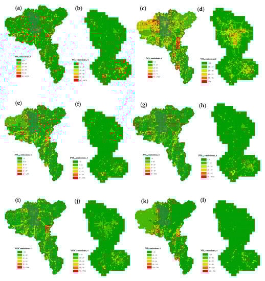 Spatial allocation of air pollutant emissions and annual concentrations in the Changzhutan (CZT) urban agglomeration in 2015. (a) sulfur dioxide (SO2) emission (3 × 3 km). (b) SO2 emission (1 × 1 km). (c) nitrogen oxides (NOX) emission (3 × 3 km). (d) NOX emission (1 × 1km). (e) particulate matter 2.5 (PM2.5) emission (3 × 3 km). (f) PM2.5 emission (1 × 1 km). (g) particulate matter 10 (PM10) emission (3 × 3 km). (h) PM10 emission (1 × 1 km). (i) volatile organic compounds (VOCs) emission (3 × 3 km). (j) VOCs emission (1 × 1 km). (k) ammonia (NH3) emission (3 × 3 km). (l) NH3 emission (1 × 1 km).