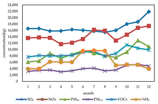 Figure 4 illustrates the monthly changes in the emission of major air pollutants in the CZT urban agglomeration. It can be seen from the figure that the monthly trend of pollutant discharge is relatively stable overall. Nevertheless, the monthly discharge of some pollutant’s peaks in autumn and winter. Among them, the concentration of SO2 reaches the highest in December, and NO2 emission reaches two peaks during July–August and November–December throughout the year. VOCs are found to peak in October, and the concentration of PM (PM10, PM2.5) rose rapidly in November. Generally, it is obvious that multiple pollutants peak in the autumn or winter. This may be caused by the following three points: firstly, heating in winter leads to the increase of coal consumption and the emission of a variety of air pollutants; secondly, the weather conditions in this period are not conducive to the spread of pollutants, resulting in constant deposition of pollutants; thirdly, the CZT urban agglomeration is surrounded by mountains on three sides. Atmospheric pollutants in the north migrate to the CZT urban agglomeration under the influence of the winter monsoon. The mountainous areas block the air mass and limit the diffusion of atmospheric pollutants. The accumulation of atmospheric pollutants in the CZT urban agglomeration causes a peak value. On the contrary, the peak of NH3 emission appears in the June–August, which probably relates to a sharp rise in temperatures in June. During this time, high temperatures will promote the breeding of livestock and increase the evaporation of NH3 in livestock and poultry, as observed in the study of Wang []. Besides, nitrogen fertilizer will be widely applied for crop planting, which can also contribute to the emission of NH3.