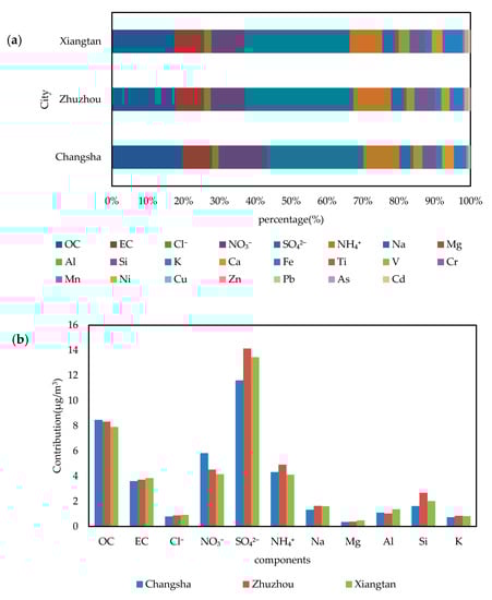 The composition of PM2.5 in three regions are determined based on the local measurement. There are 23 kinds of components found in the particles as shown in Table S4. On the whole, there is little difference in the content of the main components in three cities. The major species of the PM2.5 in CZT urban agglomeration in 2015 are SO42−, OC, and NO3−, with the annual average concentration reaching 13.06, 8.24, and 4.84 μg/m3, respectively. Zhuzhou has the largest industrial area in the CZT urban agglomeration, so it has more SO2 and NOX emission from industrial coal-burning than the other two cities. The reason may be due to the conversion of SO2 and photochemical reaction to NOX, and then the formation of sulfate and nitrate [], which has a great influence on the concentration of PM2.5 in the three cities. Organic carbon(OC) and elemental carbon(EC) are the major emissions in the transportation sector, and the number of motor vehicles in Changsha is much larger than that of Zhuzhou and Xiangtan [], accounting for about 50.75% to the total vehicles of the three cities. Therefore, the percentages of OC and EC are higher in Changsha rather than the other two cities. What cannot be ignored is that the crustal elements (Si, Al, Ca, Fe, Mg, Mn, Ti, V, etc.) occupy 16.13%, which is also an important composition of PM2.5. K+ and Cl− are mainly derived from biomass burning [], and they combine with dust generated by construction and transportation activities [] in the air. There is little difference in the concentrations of K+ and Cl− among three cities, suggesting that the CZT urban agglomeration may have a similar source of K+ and Cl−. However, the content of crust elements in Xiangtan is always higher than that in the other two cities. This may be explained by the presence of more lead and zinc smelting enterprises near the Xiangtan sampling point. Figure 5 shows the components of PM2.5 in different cities.