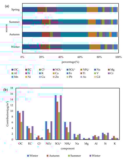 PM2.5 compositions in different seasons. (a) The percentage of 23 components of PM2.5 in different seasons. (b) PM2.5 main component concentration in different seasons (μg/m3).