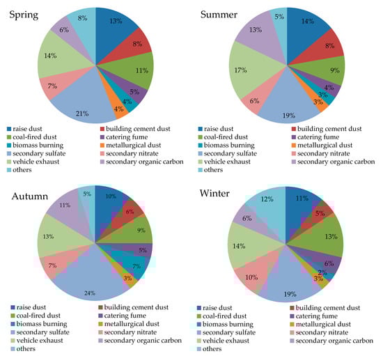 Seasonal variation has been observed in the contribution rate of different PM2.5 sources in CZT urban agglomeration as showed in Figure 8. The contribution of secondary sulfate and vehicle exhaust rank first and second in each season. The secondary sulfate contribution rate is the highest in autumn (24%), and the vehicle exhaust is the highest in summer (17%). Since industrial source emissions contribute the most to the secondary sulfate concentration in PM2.5, the impact of industrial emissions continues to be of concern. The contribution rate of secondary organic carbon is the highest in summer, accounting for about 13%. Raise dust and building cement dust have a relatively high contribution in spring and summer, which is 2–4% higher than autumn and winter. In the case of significantly less precipitation during the autumn and winter seasons, the reason for this phenomenon may be that the construction time in spring and summer is longer than that in autumn and winter. In addition, the relative contribution rate of coal-fired dust in different seasons is between 8% and 13%, which is relatively stable. The contribution of catering fume and metallurgical dust in four seasons is very small, but it cannot be ignored.