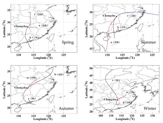 The pollution level of local atmospheric pollutants is affected by many factors. Under the control of different air masses, the concentration of pollutants varies greatly []. The clustering of airflow sources after 72 h in four seasons is illustrated in Figure 9. The CZT urban agglomeration is mainly affected by the medium-distance transmission air masses. The source and transmission path of air masses are greatly affected by the season. In spring, the eastern air mass originated from the central part of Jiangxi accounts for 63% of the airflow transfer; 20% are attributed to air mass moving north by passing through Henan and Hubei, and 17% of the airflow transfer is determined by the southwestern air mass passing Guangdong. In summer, southwestern air masses from Guangxi and Guangdong controls 87% of the airflow transfer while 13% left is affected by the northeastern air mass passing through Zhejiang, southern Anhui, and northern Jiangxi. The northeastern air mass, which passes through Jiangsu, Anhui, and Hubei, determines 92% of the airflow transfer in autumn, and the 8% left is impacted by the southwestern air mass passing through Guangdong. Variation of air mass in transfer distance and direction is observed in winter. The southwestern air mass passing through Anhui, southern Hubei, and northern Jiangxi controls 72% of the airflow transfer. Air mass from southern Guangdong affects 20% of the airflow transfer while the 8% left is impacted by air mass passing through Inner Mongolia, Shanxi, Henan, and Hubei. The relatively short airflow trajectory indicates that the atmospheric environment is relatively stable and prone to cause the accumulation of pollutants. Judging from the transmission distance to the air mass after 72 h in each season, the main airflow trajectory is longer in summer and autumn, which is not conducive to the accumulation of pollutants.