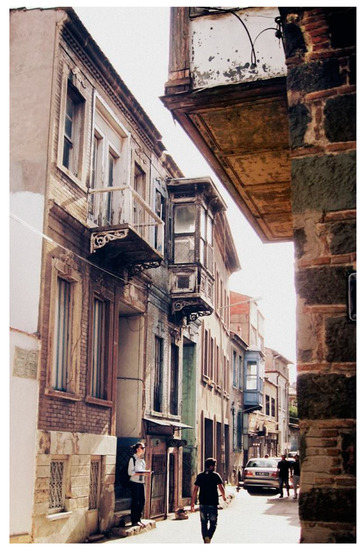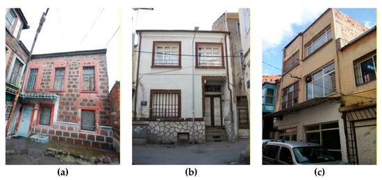 A total of 22 buildings, covering historic and contemporary buildings which lie on 1273 Street, are investigated (Figure 1). There are 4 solely commercial and 18 residential buildings, 3 of which have shops on their ground floors. Both historic and contemporary buildings coexist in the street, situated in adjacently. Of the 22 buildings, 13 are historic ones, in total: 11 of them are officially registered, while the remaining 2 are determined as non-registered in character. The rest are the contemporary buildings. The number of floors varies between one and three. A large majority of extant historic buildings were built between the end of 19th and the first quarter of 20th centuries. A total of 20 buildings were constructed with stone or a brick masonry system. There are only two reinforced concrete buildings. The oriels on the second floors designed as a protrusion with wooden or iron structure, ornamentations on iron doors and stone wall order are typical periodic characteristics of historic buildings (Figure 2).