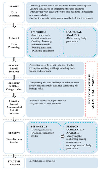 The identification process of retrofit strategies is composed of seven main stages: data collecting, data processing, creating possible retrofit solutions, categorizing buildings, assessing retrofit solutions, analyzing data and presenting results (Figure 3). This method starts with the quick field survey, i.e., data collection conducted in several levels. First, documents about the case area are obtained to get preliminary information. The data sheets are created to characterize of the buildings in the case area. Then, on-site measurements on the buildings’ envelope are carried out through data sheets. Additionally, it is attempted to get information about the buildings in use from the users of buildings.