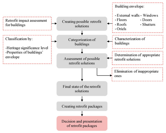 In order to determine energy-efficient solutions for historic urban fabric and find the most appropriate solutions for building envelope, a set of actions were organized, starting with a preliminary analysis of possible retrofit solutions by taking into account a literature survey, including guidelines, standards and publications. This section continues with the categorization step. A total of 22 buildings were classified and characterized by number of qualitative and quantitative data. Afterwards, a pre-assessment was conducted to find the best retrofit solutions by excluding inappropriate ones and identify a series of acceptable measures. After this process, retrofit solutions were grouped under retrofit packages by combining the best solutions. This step served the purpose of revealing which packages were most appropriate toward the targets of the study by evaluating and comparing different retrofit scenarios with each other and the base case. The final step was composed of the decision and presentation of retrofit packages (Figure 5).