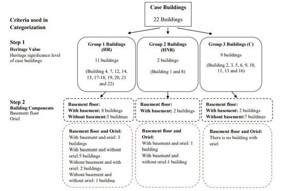 Categorization starts with the heritage significance level, which is of top priority because of the most decisive and distinctive criteria at the first stage of categorization. It continues with characterizing the architectural components of building envelopes, i.e., walls, floors, roofs and oriels affecting the number and type of retrofit solutions produced for each building and how they work and are applied to building structure. The availability of basement floors and oriels in the case buildings were initially selected as criteria after the selection of the heritage significance level.