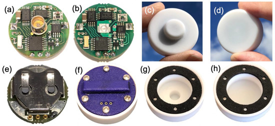 EUV dosimeter construction: printed circuit board (pcb) incorporating (a) Type A and (b) Type B AlGaN photodiodes; PTFE diffuser caps for the (c) Type A and (d) Type B dosimeters; (e) pcb backside showing the CR1632 lithium-ion battery and holder, (f) nylon backing plate showing the 3-pin micro data port, inside of the (g) Type A and (h) Type B diffuser caps with neoprene gaskets.