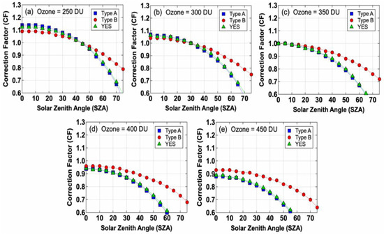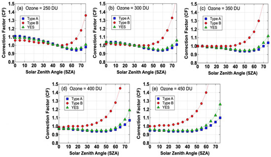 In principle, it is possible to correct any broadband instrument in a fixed setting for spectral mismatch errors (i.e., the output error due to deviations in spectral responsivity from the CIE erythemal action spectrum) via the calculation of correction factors (CFs) that are a function of SZA and total ozone column measured in Dobson units (DU), using radiative transfer model calculations (TUV 4.1a) [42]. These CFs provide a quantitative measure of the spectral mismatch error, and should approach unity for all SZA and ozone values for a perfect match. Figure 4 shows the CFs for the Type A and Type B photodiodes and the YES erythemal radiometer for a range of SZA (5-degree steps) and ozone levels (50 DU steps) determined by calculating the ratios between erythemally weighted irradiances and irradiances weighted by the instrument spectral response functions (see the Supplementary Material for the numerical tables). The CFs for other SZAs were interpolated. Ozone values from 250 DU to 450 DU were used as these are representative of the maximum annual ozone variations over New Zealand, with mean monthly variations typically between 250 DU and 350 DU [12,43]. The CFs were normalized to the global average ozone value of 300 DU and an SZA of 30°.