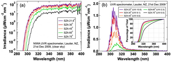 (a) Solar UVR spectra (2 nm resolution) for different SZA taken on the same clear sky summer day, 21 December 2009 at Lauder, NZ (Lat: −45.0 Long: 169.7 Alt: 370 m) using a UVR spectrometer, and (b) the corresponding erythemally weighted UVR spectra and (inset) the cumulative erythemal UVR as a function of wavelength.