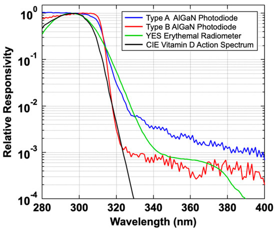Spectral responsivities of a Type A and a Type B AlGaN photodiode and the YES erythemal radiometer compared to the CIE vitamin D action spectrum.