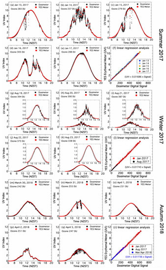 The dynamic range for this dosimeter was 0.02 to 17.25 UVI and its sensitivity (i.e., the smallest measurable change) was 0.017 UVI. The linearity of the regression curve in Figure 10f indicates that the output from the YES erythemal radiometer and the Type B EUV dosimeter were directly proportional, at least for the range of SZA (>20°) and ozone levels involved, and this is reflected in the very good agreement between the respective daily UVI graphs in Figure 10a–e. A similar linear regression was maintained in subsequent side-by-side comparisons in NZ winter and autumn conditions, indicating similar spectral mismatch and cosine response errors for both instruments. Figure 10g–k shows a comparison of daily UVI graphs measured by the same Type B dosimeter and YES erythemal radiometer over 5 days in August 2017 (NZ winter), using the summertime linear calibration coefficient for dosimeter UVI. These also showed good agreement, while Figure 10l shows that the linear regression coefficient for the 5 winter days was only ~3% different from that for the summer. There was a small discrepancy at low UVI levels (< 1), which under clear-sky conditions correspond to SZA > 60°, and this can be seen in the inset UVR graphs that use a magnified UVI scale. These are the previously identified conditions (Section 3.1), where the SZA-related differences in the CFs of the two instruments are the largest. Figure 10m–r shows a comparison of the UVI measured by the same YES erythemal radiometer and Type B dosimeter over a 5-day period in March/April 2018 (NZ autumn), again using the summertime linear calibration coefficient for dosimeter UVI.