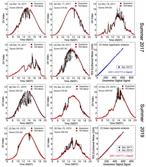 To assess its long-term stability, the Type B dosimeter #2 used in Appendix A was calibrated against the same YES erythemal radiometer at NIWA, Kyle St. Christchurch, New Zealand in December 2017 and 24 months later in December 2019, with the results shown in Figure 11. A linear regression coefficient of 0.01713 was determined in December 2017, as shown in Figure 11f. This calibration coefficient was used to convert the digital signal of the dosimeter to UVI and to construct the daily UVI graphs for December 2017 (Figure 11a–e) and December 2019 (Figure 11g–k). There was very good agreement between the Type B dosimeter #2 and the YES erythemal radiometer for all the days across both summers, indicating that the calibration of the dosimeter was unchanged. This is confirmed by the overlap of the December 2017 and December 2019 regression curves shown in Figure 11f,l, with an almost identical linear regression coefficient measured in both summers. It is interesting to compare this close agreement across different summers with the small discrepancies shown in Appendix A between summer and autumn/winter conditions. This indicates that, where possible, the EUV dosimeters are best used in similar conditions to those used to establish their calibration [22]. This is not surprising since we showed (in Section 3.1.1.) that the effects of spectral mismatch errors between instruments increase with changing SZA and ozone conditions.