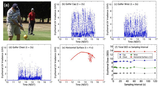 Figure 12 shows an example of the effect of sampling frequency on the calculation of integrated erythemal dose. This involved a golfer wearing EUV dosimeters on different body sites during an 18 hole round of golf (3.5 h) at Avondale Golf Course, Christchurch, New Zealand on 1 March 2017. Figure 12b–d shows the erythemal UVR irradiance versus time graphs measured using the minimum sampling interval of 2 s by EUV dosimeters attached to the golfer’s cap, wrist, and chest, respectively. Figure 12e shows the ambient UVR measured by another EUV dosimeter placed on a flat horizontal surface in a nearby open space. In each case, a change in sampling interval was achieved by reducing the t = 2 s dataset, e.g., to simulate a sampling rate of t = m seconds (where m is an even number greater than 2), every n = m/2 datapoint was selected, similar to the approach used by Heydenreich et al. [47]. Figure 12f shows the total integrated erythemal UVR dose calculated for increasing sampling intervals from t = 2 s to 120 s. This shows only a small variation in the total integrated dose with sampling interval for this particular activity.