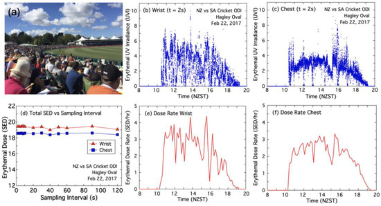 Since golfing is a reasonably active activity, involving several kilometres of walking over open and partially tree-shaded ground, a second example is provided for a more sedentary activity. This involves a spectator at an ‘one day international’ cricket match between New Zealand and South Africa held at Hagley Park, Christchurch, New Zealand, on 22 February 2017. These events typically involve thousands of spectators sitting for 6–8 h in uncovered venues that often provide very little shade and consequently the received UVR doses can be very high. Figure 13 b,c shows the erythemal UVR graphs measured by EUV dosimeters attached to a spectator’s wrist and chest, respectively. Figure 13d shows that, as before, there was only a small variation in the total integrated dose with sampling interval. Figure 13e,f also illustrates one of key advantages of EUV dosimeters compared to polysulphone film detectors. This is the ability to provide detailed information concerning erythemal dose rates during the course of a day or particular activity. Here, the erythemal dose rate in SED/h has been calculated at 10 min steps throughout the day.
