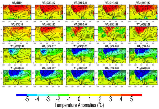 Figure 1 shows the MSLP and T2m anomaly fields composites from ERAI as the average of all weather events that fall into each of the 20 WTs. All WTs in Figure 1 show the NPH and NASH semi-permanent pressure systems over oceanic regions in the MAR. In this respect, the MAR domain is sufficiently large to capture the annual march of both features as expressed with MSLP fields. Both NPH and NASH move northward during the dry period and southward during the wet period of the MAR, a well-known feature of the MSLP field in the North Pacific and North Atlantic, respectively [29,33,50]. The position of these two semi-permanent systems is crucial to determine how synoptic conditions over the study area evolve spatially and temporally [51]. Hence the discussion of results in this study hinges on the behavior of both the NASH and the NPH throughout the year. Figure 1 also reveals a clear separation between wet ( to ) and dry ( to ) periods. The wet period is composed of two parts; the first from to , has positive T2m anomalies of up to 5 °C over the North Atlantic. The second part from to has T2m anomalies that can be as negative as −2 °C. In Figure 1 the T2m anomaly contours between 4 and 5 °C follow the longitudinal shifts of the NASH pressure centers from to quite clearly, indicating a strong link between the NASH dynamics and T2m anomalies for these WTs that are part of the wet period. The spatial pattern correspondence between T2m anomalies and the NASH spatial pattern in MSLP is lost in the second part of the wet period from to . For the dry period, on the other hand, a more uniform T2m anomaly distribution than the wet period is evident. This can be noted in Figure 1, where T2m temperature anomalies from to , range from 1 to −3 °C in both ocean basins. From ( to ) the MSLP pattern consists of weaker pressure centers for the NASH, compared to their wet counterparts with a longitudinal shift towards the eastern Atlantic.