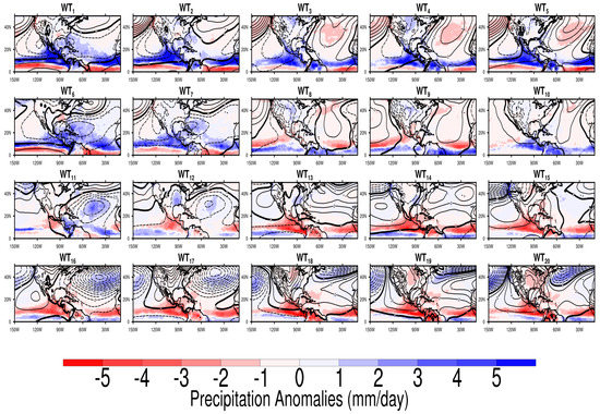 Figure 2 shows the WTs as expressed in anomalies in MSLP and precipitation. The anomalies presented in this figure reflect the dry and wet period transitions between WTs, as shown in Figure 1. They also show that the catalog of WTs obtained from SOM has a clear physical interpretation. There is a high correspondence between low (high) pressure anomalies and positive (negative) precipitation anomalies between 15° N and 50° N. The latitudinal movement of the Intertropical Convergence Zone (ITCZ) southwards (northwards) in dry (wet) periods produces a deficit (surplus) in precipitation in the tropical band between (0° N–15° N) in both ocean basins [33]. A good agreement between MSLP anomaly fields and precipitation anomaly serves as a verification that the WT catalog can properly identify circulation patterns in the subtropics and tropics in a consistent way.