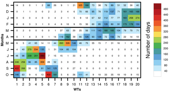As stated in the prior sub-section, the prescribed number of nodes (20 in this study) for the SOM algorithm determines the number of discrete WTs. We denote each of these WTs as with . The algorithm allocates a set of daily events to each WT. In order to evaluate the synoptic-scale variability of WTs, we first define an “event” as a sequence of consecutive days greater than or equal to two days featuring the same WT. Mean persistence of a WT is measured as the average duration of all events with the same WT.