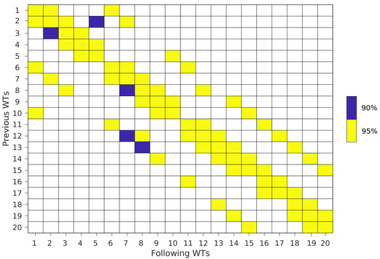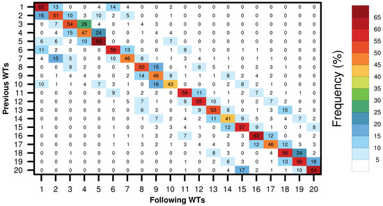 Transitions that occur on a day-to-day basis between WTs are computed assuming that transitions from one WT to another behave as in a Markov chain process [47]. In this process, it is assumed that the probability of transition between two atmospheric circulation states depends only on the previous one. This assumption permits the computation of the statistical significance of transitions among the WTs. The usage of a Markov chain process is justified a posteriori in the results section and we note that several past studies on weather typing have utilized it [47,48,49]. Statistical significance of transitions is calculated as in Vautard et al. [47], using a Monte Carlo test with 10,000 permutations defining a confidence level of 90%.