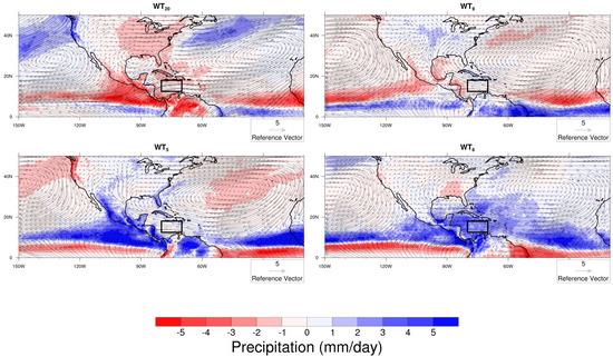 From Figure 2, two representative WTs for winter are and . These WTs show different MSLP large-scale configurations from the tropics to higher latitudes. shows a deep anomalous trough over the North Atlantic and shows a longitudinal shift of the NASH pressure center to the east. Over the continent, positive anomalies in MSLP are present in , whereas for MSLP anomalies are close to zero. Finally, another feature is , which corresponds to the dry-cold period in the MAR. This WT shows positive precipitation anomalies over the southeastern US that correlate very well with negative MSLP anomalies; as mentioned before, it is probably linked to the seasonal march from dry to wet period. Regarding the wet period, represents typical wet period conditions characterized by a positive precipitation anomaly along from northern South America, Central America, Mexico and the central US. This is consistent with negative anomalies of the MSLP over the northwestern coast of Mexico when the rainy season is well established.