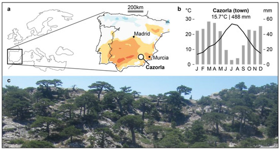 Study site and climate. (a) Location of the Cazorla Natural Park (CNP) in southern Spain. Colors indicate mean summer temperatures exceeding 24 °C in yellow, 26 °C in orange, and 28 °C in red. (b) Climate diagram of the station located in the town of Cazorla ~10 km northeast but 1000 m below the black pine sampling site. (c) Photograph of the tree site in the CNP.