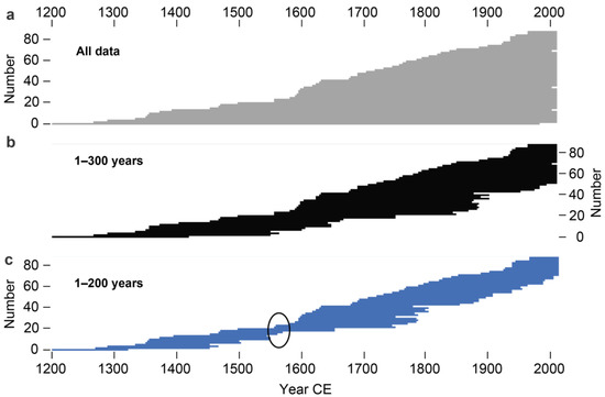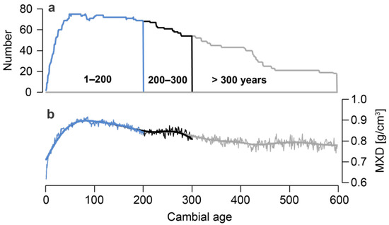 The combined MXD dataset covers the period from 1196–2014 CE and includes 18 series exceeding ages of 600 years (Figure 2a). The data contain an age trend composed of a notable ~0.2 g/cm3 increase over the first 90 years of cambial age, followed by a persistent, though much shallower, negative trend over the subsequent 500 years (−0.12 g/cm3 from 100–500 years). This Hugershoff-shape [34] age trend is characteristic for conifer MXD data [35,36] and represents noise from the perspective of a climate reconstruction. This noise is here removed by applying Regional Curve Standardization (RCS) to preserve high-to-low frequency variance in detrended index chronologies [37,38]. However, successful RCS-detrending typically requires the application to combined datasets integrating series from living and dead trees, so that younger and older tree-rings are spread throughout time, rather than being concentrated at the beginning (young rings) and end (old rings) of a chronology [39]. To produce such chronology variants, characterized by flat instead of monotonically increasing mean age curves, we removed all rings older than 300 (200) years from the MXD data and calculated 1–300 (1–200) year age-band chronologies, here labeled ABC300 and ABC200 [40]. The differentiation by cambial age is illustrated in Figure 2, showing the replication and regional curves (RCs) of all MXD data in gray, and the 1–200 and 201–300 sections in blue and black, respectively. Figure 3 illustrates the effects of data truncation on the temporal distribution of MXD data throughout the past 800 years and demonstrates that any chronology derived from the 1–200 year age band data is weakly replicated in the late 16th century, for instance (see the circle in Figure 3c).