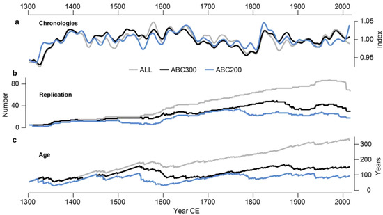 The removal of data older than 300 and 200 years produced chronologies that are likely more reliable over the most recent centuries, during which the ALL chronology is characterized by a monotonic age increase. During earlier chronology periods, particularly before 1650 CE in ABC200, the data truncation likely weakened the age-band chronologies, as the already reduced replication of the ALL chronology is further lowered by removing old rings. Before 1500 CE, however, these effects become negligible, as the ALL chronology is composed of only a few young rings, i.e., no additional rings were removed in the ABC300 and ABC200 chronologies.