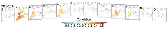 Correlation fields. Maps showing the spatial correlation patterns of the ABC300 chronology against gridded monthly temperatures (CRU TS4.03) from 1905–2014. Colored areas are significant at p < 0.1.