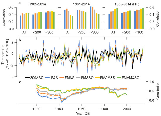 Temperature signal estimation. (a) Correlations of the ALL, ABC300 and ABC200 chronologies against seasonal temperatures (F&S, FM&S, FM&SO, FMAM&S, FMAM&SO) over the 1905–2014 period (left panel), 1961–2014 period (middle panel), and 1905–2014 period after high-pass filtering the data (right panel). (b) The ABC300 chronology in black shown together with five seasonal temperature records. The MXD chronology was scaled to the mean and variance of the FMAM&SO temperatures from 1905–2014. (c) Thirty-year running correlations between the seasonal temperatures and the ABC300 chronology from 1905–2014.