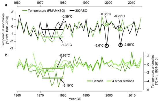 Considering the transferred ABC300 chronology, the fit with post-1960 FMAM&SO temperatures is characterized by (i) an offset during the 1970s and early 1980s, and (ii) two negative extremes in 1999 (−2.60 °C) and 2005 (−2.55 °C) that are not reflected in the observational data (Figure 7). During the 1970s, the average reconstructed temperature is ~1 °C warmer than the average instrumental temperature (see the horizontal bars in Figure 7a), marking a substantial decadal scale proxy-target difference and questioning the reliability reconstructed temperatures at this frequency. However, this offset is substantiated by markedly cooler temperatures recorded at the Cazorla temperature station (dark green in Figure 7b, t1971–80 = −3.19 °C), compared to the other stations records from Jaen, Ciudad Real, Albacete, and Murcia (t1971–80 = −0.93 °C). Of the five records compared here, Cazorla is the only station not included in the Global Historical Climatological Network (GHCN) [72], which could serve as an argument to exclude these data from calibration trials. On the other hand, Cazorla is the closest, and is therefore likely the most representative station for the calibration of high-elevation CNP MXD data (Table 2), which again supports its use. An assessment of the underlying reasons of the deviating 1970s temperatures, be it changes in the station’s environment and instrumentation or (real) spatial variability, would require studying the station history and metadata, and monitoring current temperatures at historical sites [66,67], which is beyond the scope of this paper. From a tree-ring perspective, the 1970s proxy-target difference reported here adds uncertainty to any reconstructed lower frequency deviation derived from the CNP MXD data.