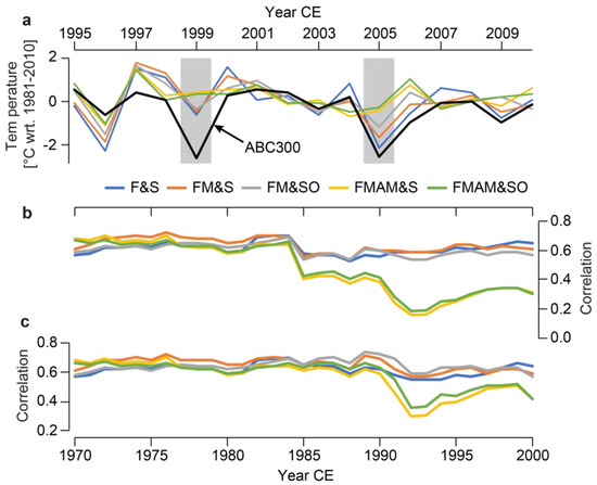 Beyond these seasonal and frequency-dependent changes, the different chronologies—ALL, ABC300 and ABC200—all produce similar results, i.e., the calibration differences are statistically insignificant (not shown). Likely more important are the temporal changes in signal strength, as revealed by the running window correlations, demonstrating substantially higher proxy-target covariances since the 1980s for the shorter F&S, FM&S, and FM&SO seasons (the blue, orange and gray curves in Figure 6c). On the contrary, the longer FMAM&S and FMAM&SO seasons correlate better during the early period of overlap with instrumental data, whereas the shorter season correlations decline before the 1960s. Such early-calibration-period decreases are fairly common [62] and are typically related to increased observational temperature uncertainties due to changes in instrumentation, data gaps, station relocations, etc. [44,63,64,65,66,67,68,69,70,71]. The recent, post-1980 correlation decline, seen in the longer seasonal means (FMAM&S and FMAM&SO), is more relevant, however, and deserves further attention before producing a formal temperature reconstruction based on the CNP MXD data.