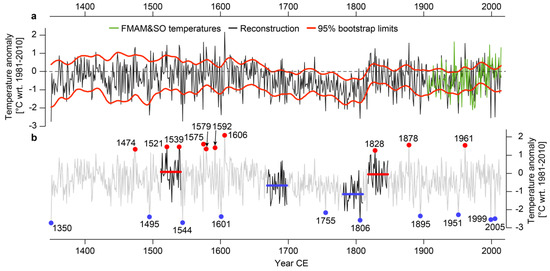The most striking, and statistically significant feature is the ~1 °C change from exceptionally cold late-18th-century conditions (t1781–1810 = −1.15 °C ± 0.64 °C) to record levels of warmth in the early 19th century (t1781–1810 = −1.15 °C ± 0.64 °C). This rapid temperature increase is centered around the Tambora eruption in 1815 that is marked by cold FMAM&SO temperatures in the 1816 “year without a summer” [74] (t1816 = −2.1 °C ± 0.55 °C, the 14th coldest year since 1350 CE). Whether this change from colder to warmer conditions is related to external climate forcings could perhaps be evaluated by comparison with climate model simulations [75]. The rapid transition from low-to-high temperatures throughout the Dalton Solar Minimum from 1790–1830 [76] suggests, however, that this lower frequency temperature change is not related to solar forcing. Before this period, and particularly before 1600 CE, the bootstrap confidence limits (red curves in Figure 9) markedly increase, demonstrating that the FMAM&SO temperature estimates are less reliable back in time (Supplementary Figure S7).