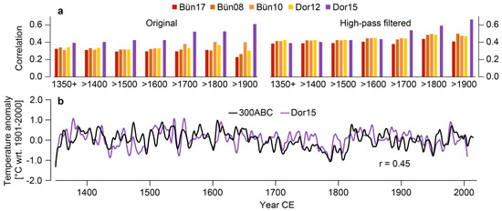 Comparison with existing reconstructions. (a) Pearson correlations of the ABC300 temperature reconstruction with warm season temperature reconstructions from the Pyrenees (Bün08, Bün10, Bün17, Dor12) and a previous-year late summer temperature reconstruction from CNP tree-ring width (TRW) data (Dor15). The Dor15 record has been reversed and shifted by one year (see Methods). The left panel shows the results for the original reconstructions, right panel after 10-year high-pass filtering the timeseries. (b) The 10-year smoothed ABC300 reconstruction plotted together with the (reversed) Dor15 reconstruction since 1350 CE.