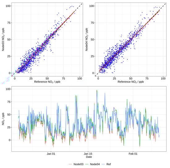 The performance of the AGO for PM, PM and NO was established by co-locating the nodes with a reference monitoring station. Validation was performed from December 2017 to February 2018 by co-locating the AGO at District of Columbia Municipal Regulations’ (DCMR) Schiedam air quality monitoring station in Rotterdam, the Netherlands. The concentration of NO was measured by a reference standard chemiluminescence NOx analyzer, and concentrations of PM were measured by a Met-One BAM 1020. Measurement conditions ranged from 30% to 70% RH and −0.2 to 17.5 °C. The time series and the correlation plots of the reference NO concentrations and the NO concentrations measured by Node03 and Node04 are shown in Figure 1. The linear regression fit (solid red line) and a 1:1 line (dashed black line) are shown for both sensor nodes in the scatter plots. Correlation plots and time series plot for PM and PM concentrations are seen in Appendix A, Figure A1 and Figure A2. The performance metrics for PM, PM and NO are presented in Table 2. The high correlation coefficients ( = 0.90–0.96) for PM and NO and moderate correlation coefficient ( = 0.71–0.75) for PM indicate that the AGOs are capable of capturing the variability in pollutant concentrations despite wide variations in ambient temperature and relative humidity over the monitoring period.
