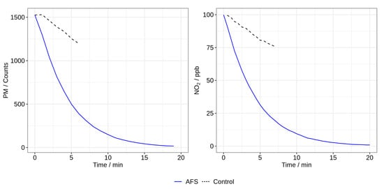 Figure 2 shows the removal of PM with an aerodynamic diameter of 0.3 m (left) and NO (right) by the AFS (solid blue line). The black dashed line is the control, which was obtained by observing the pollutants’ behavior in the chamber without the AFS in operation. For the easy comparison of the control and the removal by AFS, the starting concentrations were scaled to start at the same concentration. Even though the AFS was switched off, pollutants were still removed due to aggregation and adsorption on the walls of the chamber, and 20% of NO and PM (d = 0.3 m) was removed within 5 min. When the AFS was turned on, a more rapid removal was seen, with a removal of 63% of the starting PM (d = 0.3 m) and NO concentrations within 4.5 and 6 min, respectively. These experiments only measured PM with a diameter of 0.3 m, but the AFS removes particles of a wide range of sizes. Particles with a diameter of 0.3 m are close to the most penetrating particle size, so both larger and smaller particles are removed more effectively, and so this can be considered the lower limit for removal efficiency.