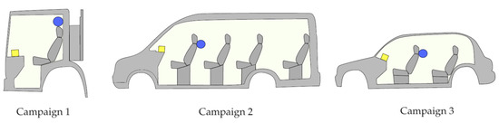 Schematic representation of the vehicles used in the three campaigns, with Campaigns 1, 2 and 3 being waste removal trucks, hospital transport vans and taxis, respectively. The yellow box represents the AirNode Generation One (AGO), and the blue circle represents the Air Filtration System (AFS).