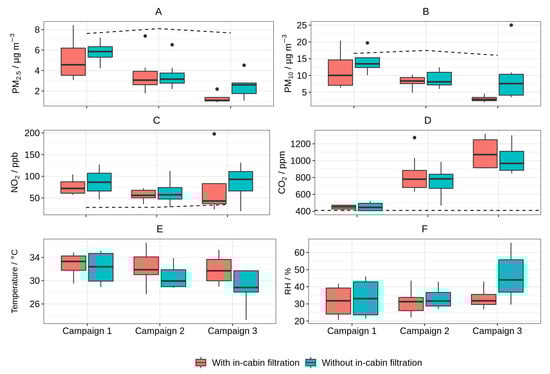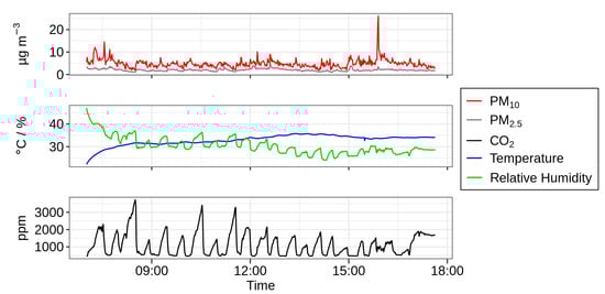 Several studies have found that the concentration of CO can increase rapidly [56,57]. The rate of increase in concentration is dependent on the vehicle volume and air ventilation rate [58]. In general, newer vehicles are better sealed and have lower ventilation through leakage and would therefore show higher CO concentrations [59]. In addition, people exhale water vapor during respiration, raising the relative humidity. This is especially the case in which the HVAC system is operated in the recirculation mode, as is often done to prevent outdoor-polluted air from entering. The data from Campaign 2, shown in Figure 5, illustrate how the in-cabin air quality is influenced by additional passengers. This time series shows the exposure levels of PM, PM and CO together with the temperature and relative humidity in a shuttle bus driving patients between St. Thomas’ Hospital and Guy’s Hospital. The route is 10 km and is driven in 20 to 45 min, depending on traffic density. Each trip is visible in the air pollution data since the levels of CO and relative humidity (RH) rise during the route due to the exhalation of the passengers and driver.