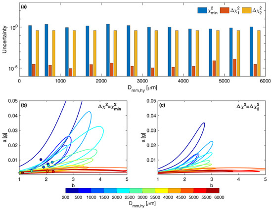 Different uncertainty sources are considered to define the tolerance of the minimum for each population. When conducting fits to observed PSDs, McFarquhar et al. [56] defined , where represented uncertainties in the observed PSDs due to statistical sampling uncertainties and characterized the robustness of the minimization procedure related to how well the observed PSD fit the assumed gamma distribution and how much variability there was in the size distributions. Here, this technique was followed and for each Dmm,hy bin is defined using the statistical uncertainty in the sampled PSD as
