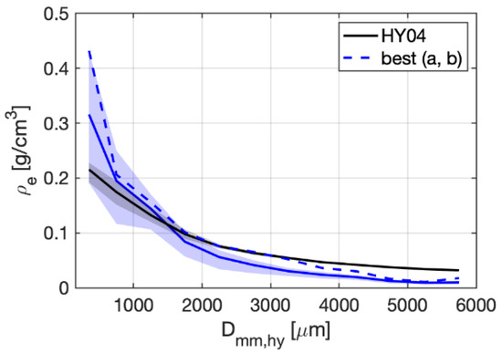 Effective density () determined by different m–D relations. The blue solid line, lower bound and upper bound of the blue shading areas represent mean values, 25% and 75% percentiles of respectively. Blue dashed line indicates the derived from the best estimate of (a, b) that minimizes in each Dmm,hy bins. Black line denotes derived from the HY04 m–D relationship.