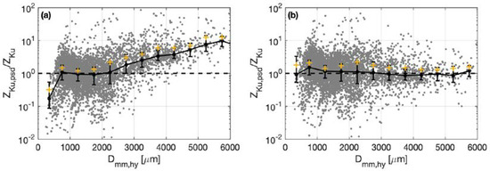By minimizing the of Ku-band radar reflectivity between APR-3 observations (ZKu) and those derived from PSDs (ZKu,psd), the dependence of m–D relation coefficients on Dmm,hy was demonstrated in Section 3.1. The best estimates of a and b coefficients differ from the HY04 coefficients especially when Dmm,hy is greater than 3 mm (Figure 2). This is also revealed by the comparisons between ZKu and ZKu,psd using the HY04 (Figure 4a) coefficients and the Dmm,hy-dependent m–D relationships (Figure 4b). The HY04 m–D relation provides accurate estimates of radar reflectivity for Dmm,hy < 3000 µm, with a median ratio of ZKu,psd/ZKu (hereafter Rz) 1.01 and a mean ratio of 1.52 ± 2.75, which means an average bias of 0.34 ± 4.37 dB; For Dmm,hy > 3000 µm, Rz tends to increase with Dmm,hy, with median values rising from 1.80 to 9.81 and mean values rising from 2.15 to 12.87, indicating average overestimates of ZKu,psd of 4.00–11.10dB. Using the Dmm,hy-dependent m–D relationships derived from the best estimates of a and b that minimized the in each population of PSDs, the overestimated Zku,psd for Dmm,hy > 3000 µm are much improved with a median Rz of 0.90 and mean Rz of 1.42 ± 1.92 (Figure 4b).