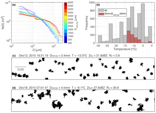 The characteristics of clouds with large Dmm,hy are shown in Figure 5. The number of particles smaller or greater than 3 mm in the PSDs varies considerably depending upon Dmm,hy. The number of particles greater than 3 mm tends to increase sharply with Dmm,hy and the number of those smaller than 3 mm decreases with Dmm,hy. This confirms that Dmm,hy gives information about the shapes of PSDs and shows the size ranges responsible for mass. Dependence of a and b on Dmm,hy also implies dependence on particle size dimension D. Clouds with Dmm,hy between 3 and 6 mm were mainly observed when temperatures ranged between −15–0 °C during OLYMPEX, of which 65.7% were between −15–−10 °C and 27.7% were between −10–−5 °C (Figure 5b). Examples of typical particle images for large Dmm,hy periods are shown in Figure 5c: aggregates of dendrites with sizes between 3 and 5 mm and even snowflakes near 1 cm are evident. These dominant secondary habits clearly illustrate that aggregation is a dominant growth mechanism for these particles.