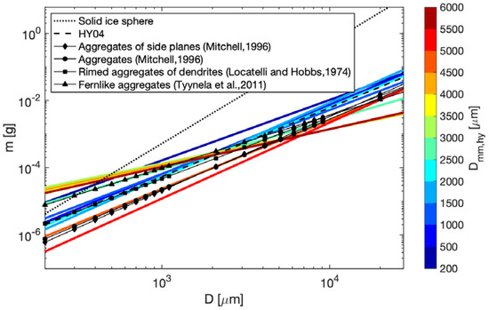 However, many different m–D relationships for aggregates have been reported based on field measurements: Schmitt and Heymsfield [63] give a = 0.0068, b = 2.22 for aggregates, which are both greater than the a and b of HY04 and will overestimate IWC and Z compared with the results of this study; Locatelli and Hobbs [24] give a = 0.0037, b = 1.9 for rimed aggregates of dendrites; Mitchell [3] reports a = 0.033, b = 2.22 for aggregates of side planes and a = 0.028, b = 2.1 for aggregates of side planes, columns, and bullets; Tyynelä et al. [60] obtain a = 0.0036, b = 1.57 for the fernlike aggregates. Single particle masses derived from these m–D relations are plotted in Figure 6 and compared with the mass derived from the best estimates of a and b shown in Figure 2. All four of the m–D relations reported for the different kinds of aggregates in Figure 6 produce smaller particle masses for particles with D greater than 3 mm compared to HY04 (black dashed line). Furthermore, they produce smaller m for D greater than 3 mm compared to the Dmm,hy-dependent m–D relations derived for Dmm,hy < 2500 µm, but larger m than that using the m–D relations derived for Dmm,hy > 3 mm. Given that the HY04 m–D relationship predicts particle masses larger than the other relationships when large aggregates greater than 3 mm are abundant, it or any other constant m–D relationships is likely not appropriate for use under such conditions.