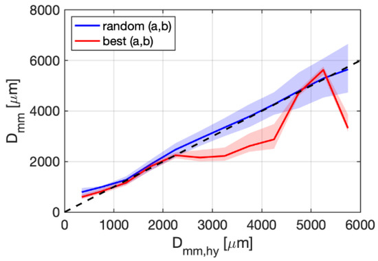 The Dmm derived by Dmm,hy-dependent m–D relationship compared to the Dmm,hy. The blue and red solid line represent the mean Dmm derived from random equally plausible (a, b) solutions and the best estimate of (a, b) that minimizes in each Dmm,hy bins respectively. The lower and upper bounds of shading areas with corresponding colors indicate the 25% and 75% percentiles of Dmm in each Dmm,hy bins.