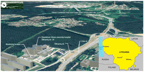 The sampling location for monitoring of PCDD/F concentration in air was selected at the distance of about 4 km in the E from the cogeneration power plant in Vilnius (see Figure 1). Moreover, the sampling location (GPS coordinates are 54°40′03.3″ N; 25°12′56.1″ E) was located 200 m away from one of the main roads (Oslo str.) in Vilnius (see Figure 1), which has traffic of about 100,000 motor vehicles per day.