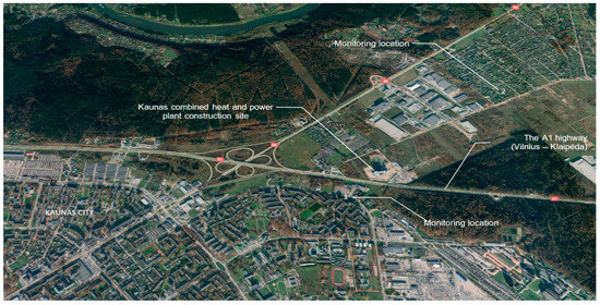 Two sampling locations for monitoring of PCDD/F concentration in air were selected in Kaunas (see Figure 2). The first site (GPS coordinates are 54°55′47.3″ N; 23°59′45.2″ E) was located approximately 500 m in the S from the cogeneration power plant. Moreover, the sampling location was located 160 m away from one of the most intensive highways in Lithuania Vilnius-Kaunas-Klaipeda (A1) which has traffic of about 30,000 motor vehicles per day. The second site (GPS coordinates are 54°56′27.5″ N; 24°02′17.4″ E) was located approximately 2.5 km in the N from the cogeneration power plant and at the distance of about 1.5 km from the highway Vilnius-Kaunas-Klaipeda.