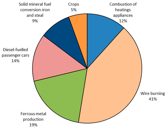 Based on monitoring and modelling results, Eastern European countries make the largest contribution to the atmospheric PCDD/Fs in the Baltic Sea region. Atmospheric PCDFs dominate the current total concentrations of PCDD/Fs in winter air. It indicates that non-industrial combustion sources are dominant, presuming that industrial production is not seasonal [41]. The impact of various industry sectors is presented in Figure 3.
