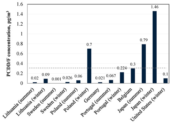 Figure 4 shows atmospheric PCDD/F measured and/or calculated in different countries in Europe, USA and Japan [42]. The concentration of atmospheric dioxins in Western Europe is lower than in other parts of the world [43]. PCDD/F concentrations recorded in urban areas are close to those of reported in non-urbanized areas, suggesting that number of pollution sources is gradually decreasing [12]. Compared to other countries, the value registered in Lithuania is average 0.02 pg/m3 (summer season) and 0.09 pg/m3 (winter season) (Figure 4), which is about 7% and 30% below the limit value of 0.3 pg/m3 as recommended by WHO. The results of PCDD/F concentration studies in urbanized areas in Lithuania are similar to those in other neighbouring Baltic countries [44]. The air concentrations of PCDD/F congeners were determined in summer and winter air using high volume samplers at a rural field station (Aspvreten, Sweden) located close to the Baltic Sea coast. During winter, PCDD/F levels were on average 20 times higher than in summer, mostly due to a higher fraction of PCDFs [45]. In Portugal, the ratio of summer to winter values is approximately 1:3 for the mean, but it reaches a ratio of about 1:6 at the extreme values [46].
