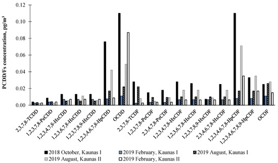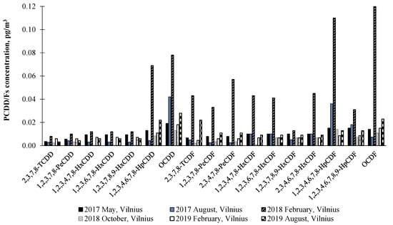 An evident peak of PCDD/F congeners in Vilnius ambient air is also observed in the winter season (see Figure 5 and Figure 7). The high concentration of these pollutants observed in February 2018 may be related to the emissions from wood and coal burning sources during the ongoing heating season. The decrease in depth of the atmospheric mixed layer and season-related weather conditions in this area might be attributable to a less effective dispersion of pollutants in ambient air.